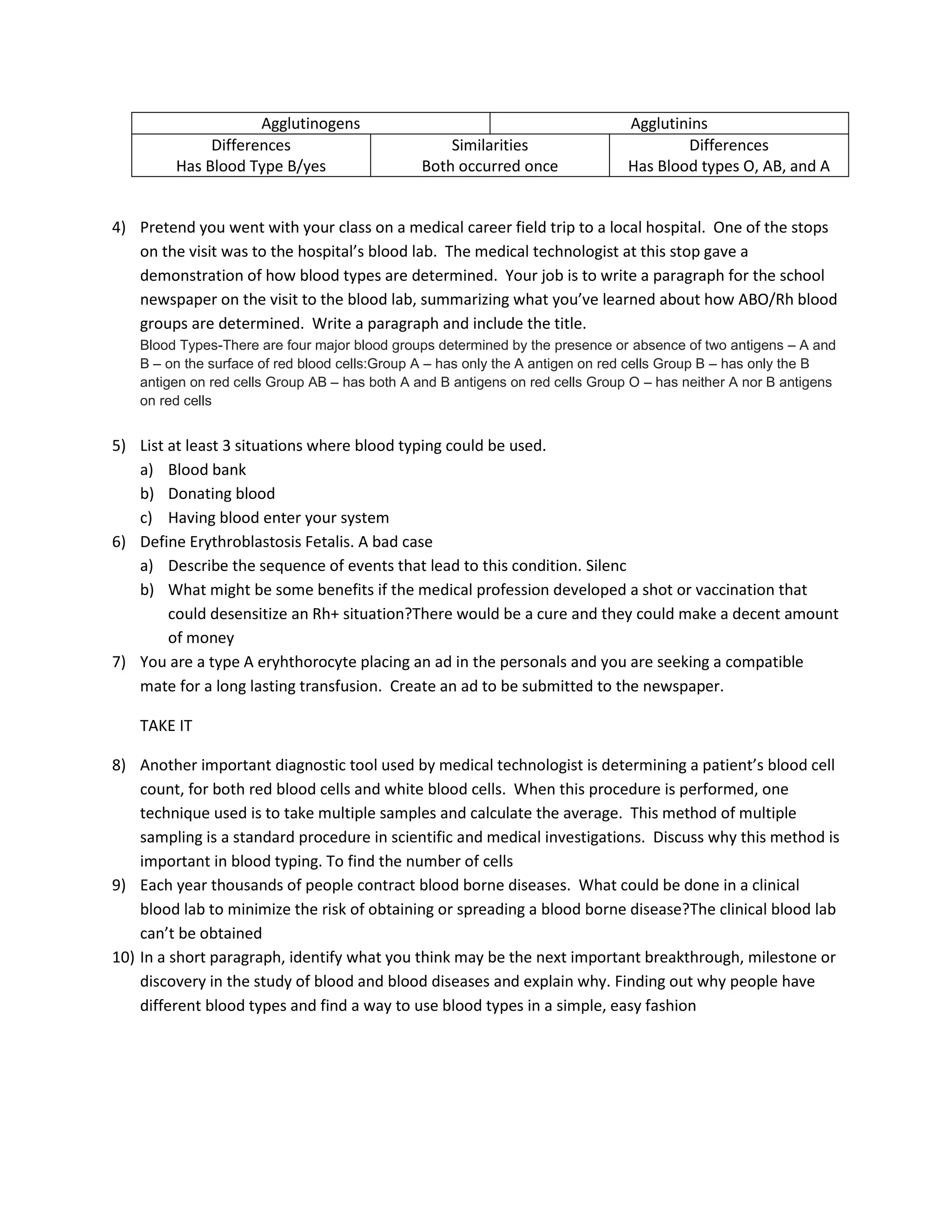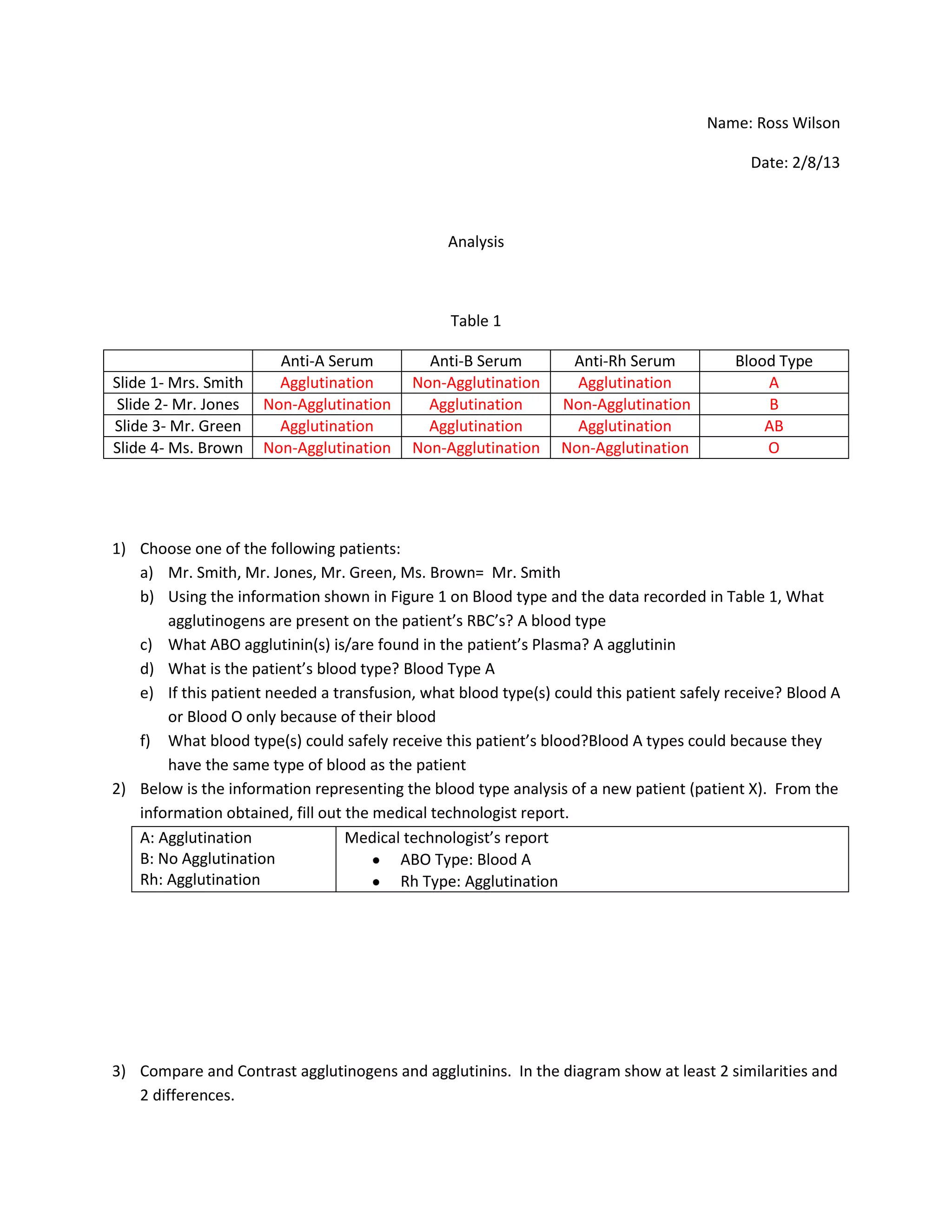 This document analyzes blood typing results for 4 patients. It identifies Mrs. Smith as blood type A based on her agglutination with anti-A and anti-Rh sera but not anti-B serum. It also discusses how blood types are determined, the differences between agglutinogens and agglutinins, and asks the student to summarize what they learned about blood typing on a field trip to a hospital blood lab.