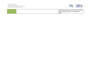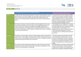 The document analyzes and describes the sound design techniques used in the video game Bloodborne. It examines four different examples - the church bells, creaking wheelchair, background music, and water drops - and speculates on how each sound effect was likely produced. The assistant identifies field recordings, studio recordings with live instruments, and digital editing of found sounds as the main production techniques used to create the realistic and immersive soundscape that helps establish the game's setting, mood, genre, and narrative.