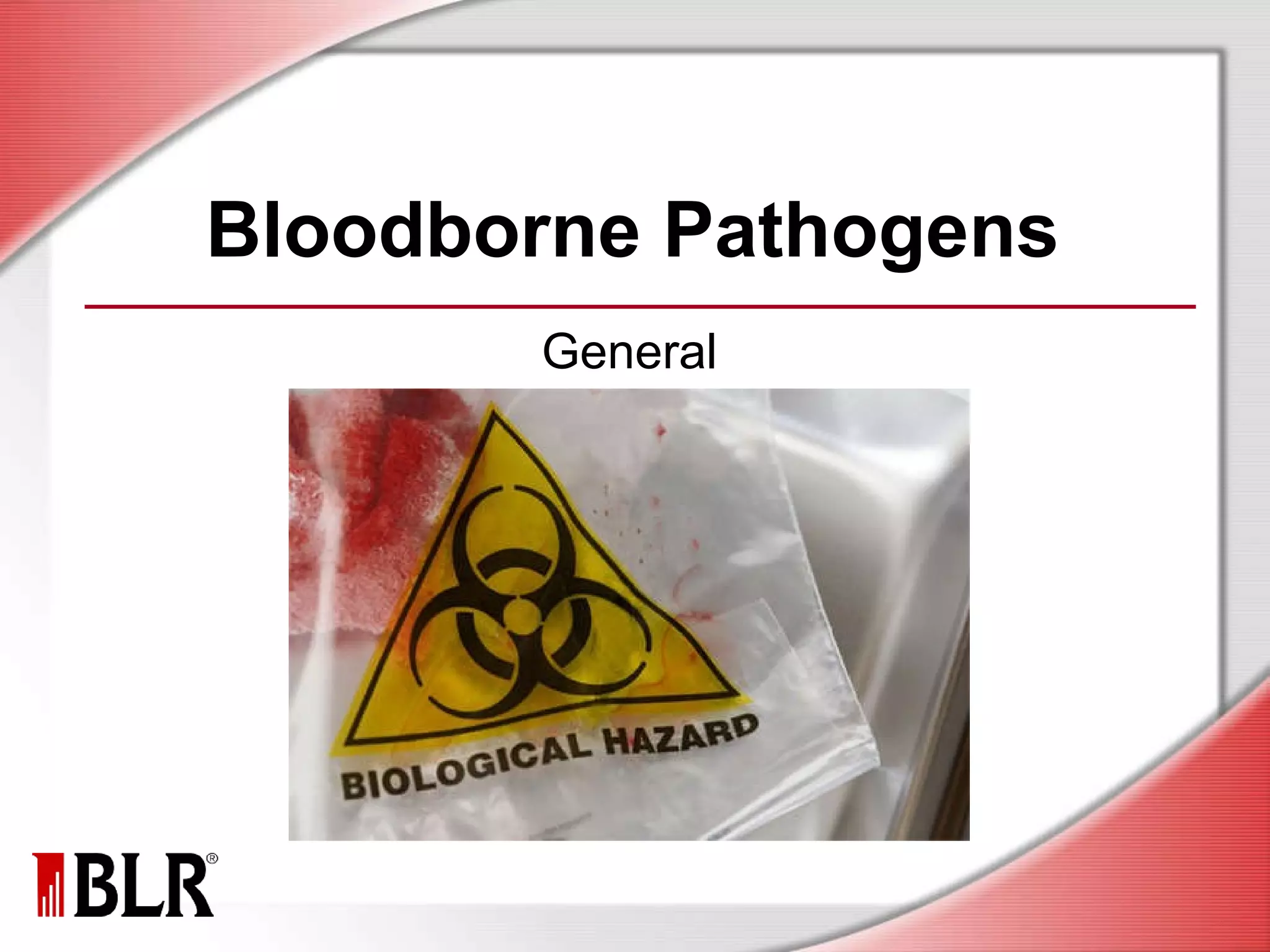 This document provides information about bloodborne pathogens (BBPs) and how to protect oneself from exposure. It identifies the primary BBPs as HIV, HBV, and HCV and discusses their transmission and symptoms. Exposure can occur through contaminated sharp objects or contact with blood. The document outlines universal precautions like using personal protective equipment and safe work practices. It also covers proper decontamination, disposal of regulated waste, evaluating exposure incidents, and receiving the hepatitis B vaccination.