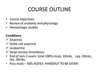 This document provides an outline for a course on blood disorders. It covers topics like anatomy and physiology of blood, hematologic studies, conditions like anemia, sickle cell anemia and leukemia. Specific types of anemia discussed in detail include iron deficiency anemia, megaloblastic anemias (pernicious anemia and folic acid deficiency), and aplastic anemia. Hemolytic anemia and sickle cell anemia are also summarized.