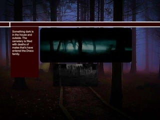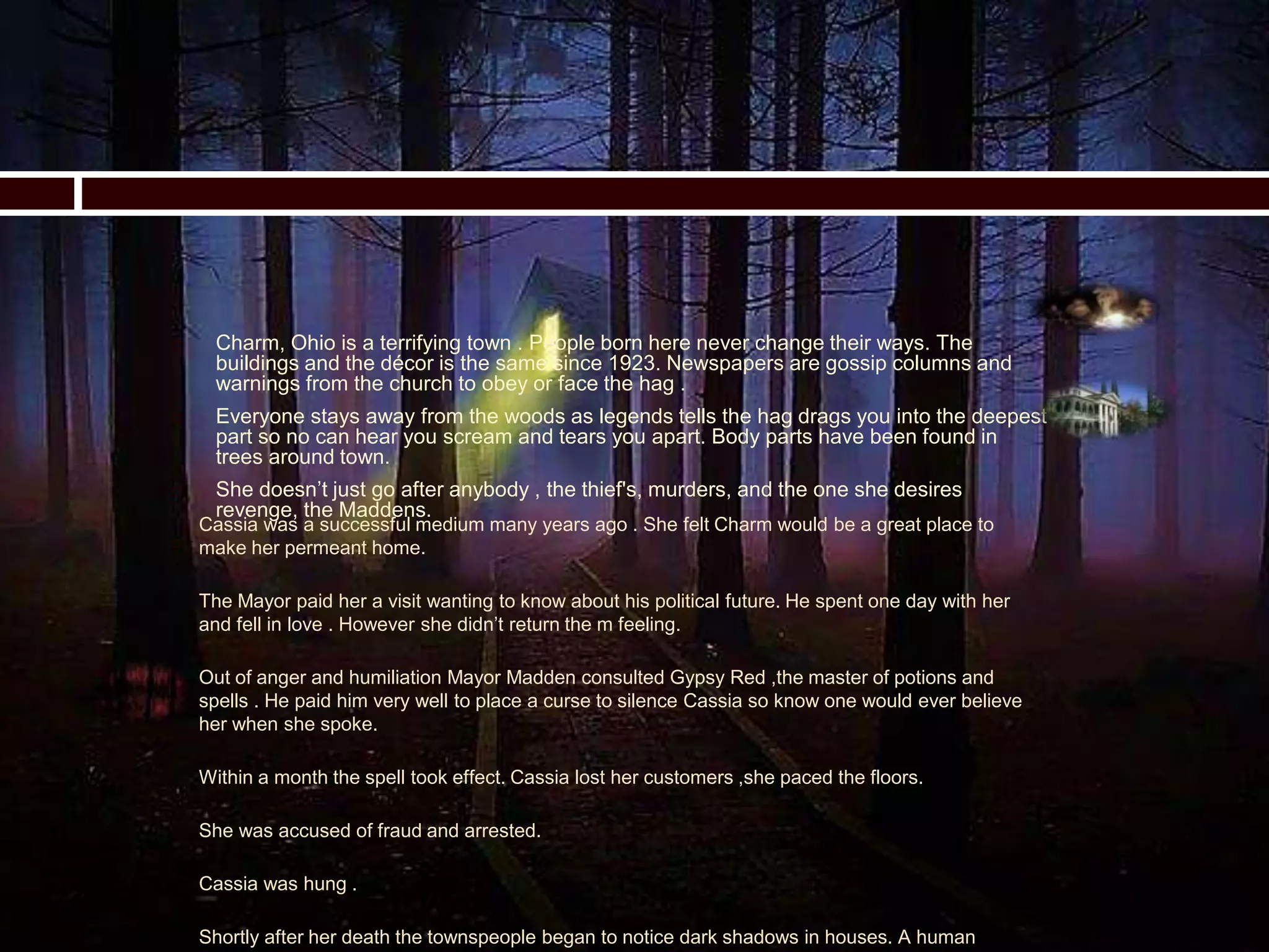 This document summarizes a story about a cursed town called Charm, Ohio. A medium named Cassia was hung after being cursed and accused of fraud. After her death, strange events began occurring in town. The curse seems to target those who have wronged Cassia or committed crimes. The story then introduces several characters, including Stella and her children Caddy and the strange boy Colin, who some believe to have "the devil's mark." Tragedies befall many of the characters. The town and Stella's house where Caddy and her children later live seem to be haunted by dark secrets and ghosts from the past.