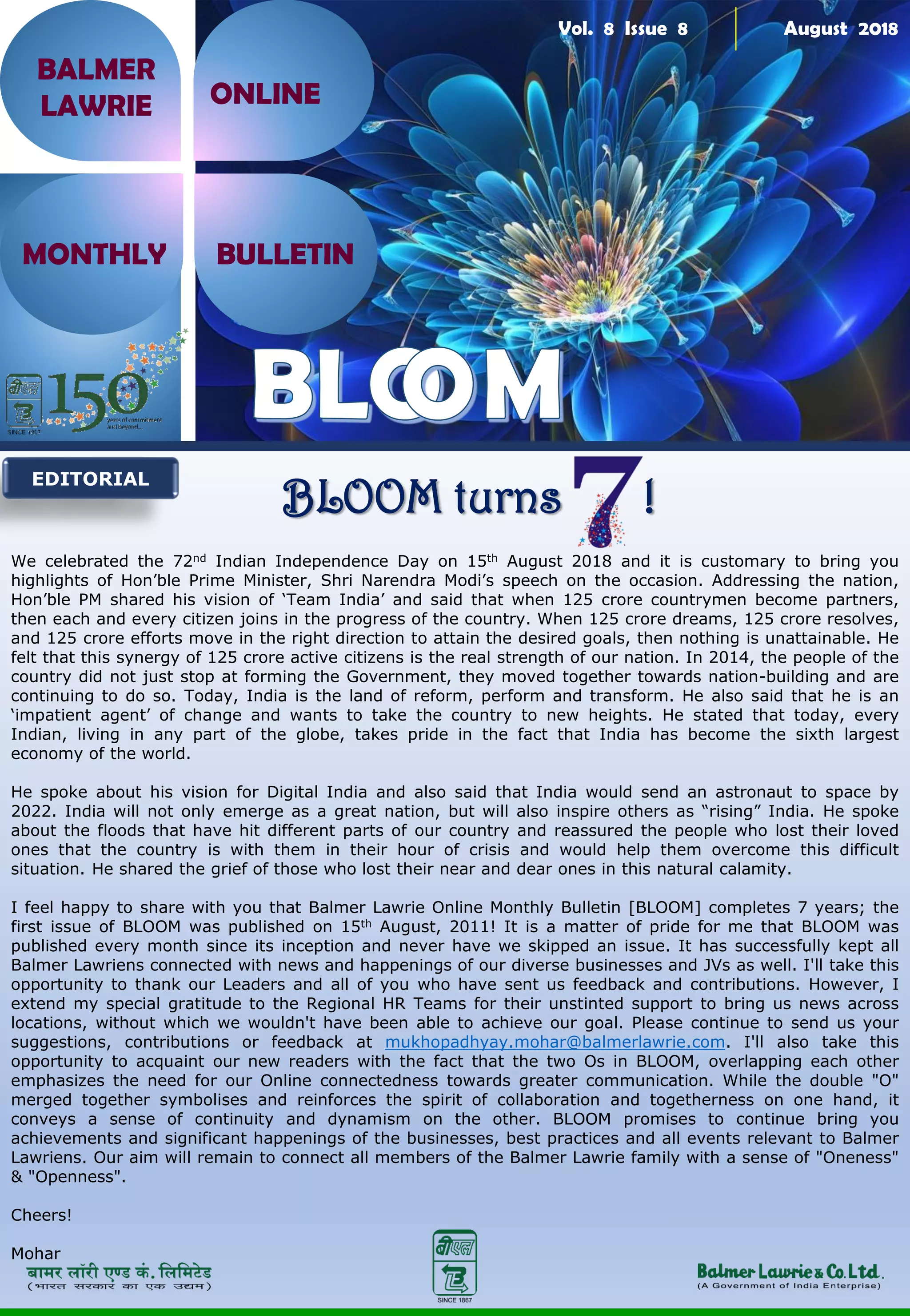 The document provides a summary of the Honorable Prime Minister Narendra Modi's speech on India's 72nd Independence Day on August 15, 2018. It discusses his vision of 'Team India' with 125 crore citizens working together towards national development. It also mentions India's growing economy and his goals for initiatives like Digital India and sending an astronaut to space by 2022. The document then summarizes the monthly newsletter of Balmer Lawrie & Co. Ltd., highlighting business updates and achievements over the past 7 years of its publication. It recognizes employee contributions and concludes by reaffirming the newsletter's role in connecting all employees.