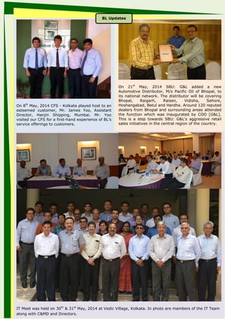 The document provides a summary of events that occurred in May and June 2014 within Balmer Lawrie & Co. Ltd. It mentions that the FY2013-14 financial results were announced on May 29th. It also notes that World Environment Day was observed on June 5th across locations and an online quiz was held. Finally, it provides personnel updates such as transfers and retirements that took place in May 2014.