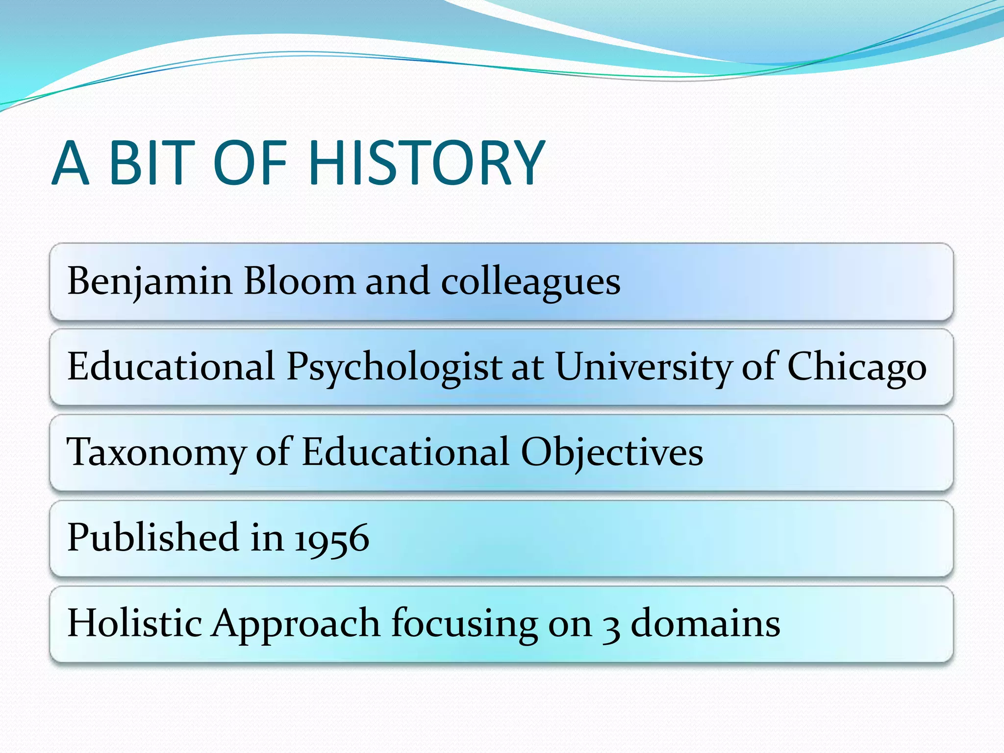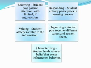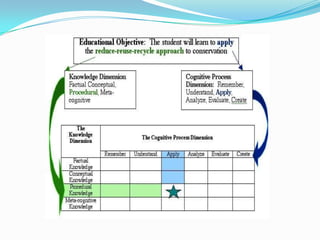 This document discusses Bloom's Taxonomy, which classifies educational goals into three domains: Cognitive, Affective, and Psychomotor. The Cognitive domain was revised by Anderson and Krathwohl in 2001 to better align with 21st century skills. The revised taxonomy has six levels within the Cognitive domain - Remembering, Understanding, Applying, Analyzing, Evaluating, and Creating. Objectives are classified based on the type of knowledge (factual, conceptual, procedural, metacognitive) and cognitive process verb used. The document provides examples of verbs to write objectives for each cognitive process level.