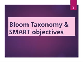 The document outlines Bloom's Taxonomy, developed in 1956 to enhance higher-order thinking in education, emphasizing cognitive, affective, and psychomotor learning domains. It details cognitive processes from remembering to creating, using action verbs for educators to promote and measure learning effectively. Additionally, it introduces SMART objectives to support lesson planning and goal setting.