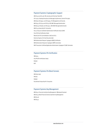 The Bloombase Spitfire KeyCastle Payment Systems Security Server provides cryptographic key management and strong security for payment systems. It supports a wide range of encryption algorithms, hardware security modules, and standards like NIST FIPS 140-2. The server allows for secure key generation, storage, and life-cycle management to protect electronic transactions.