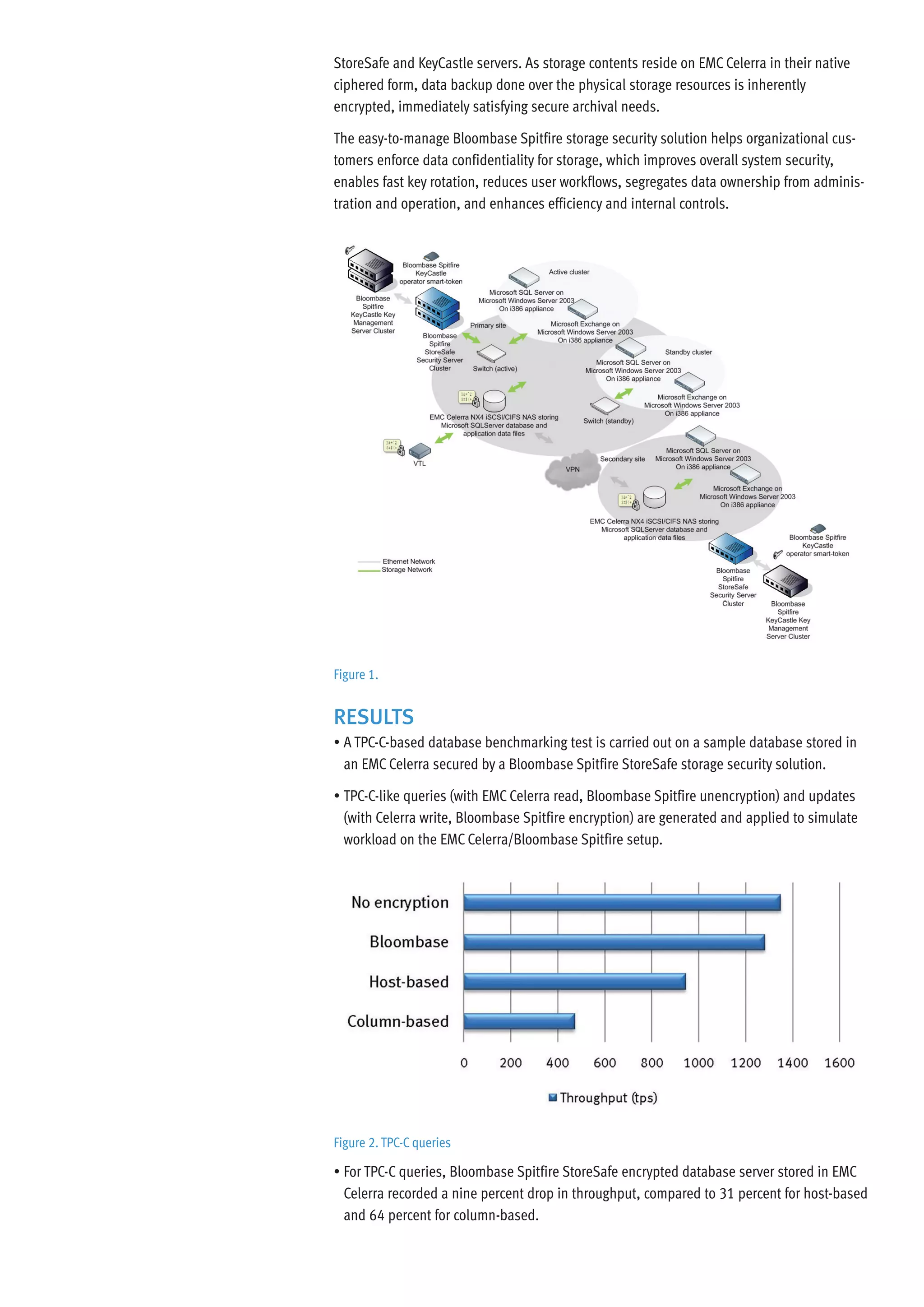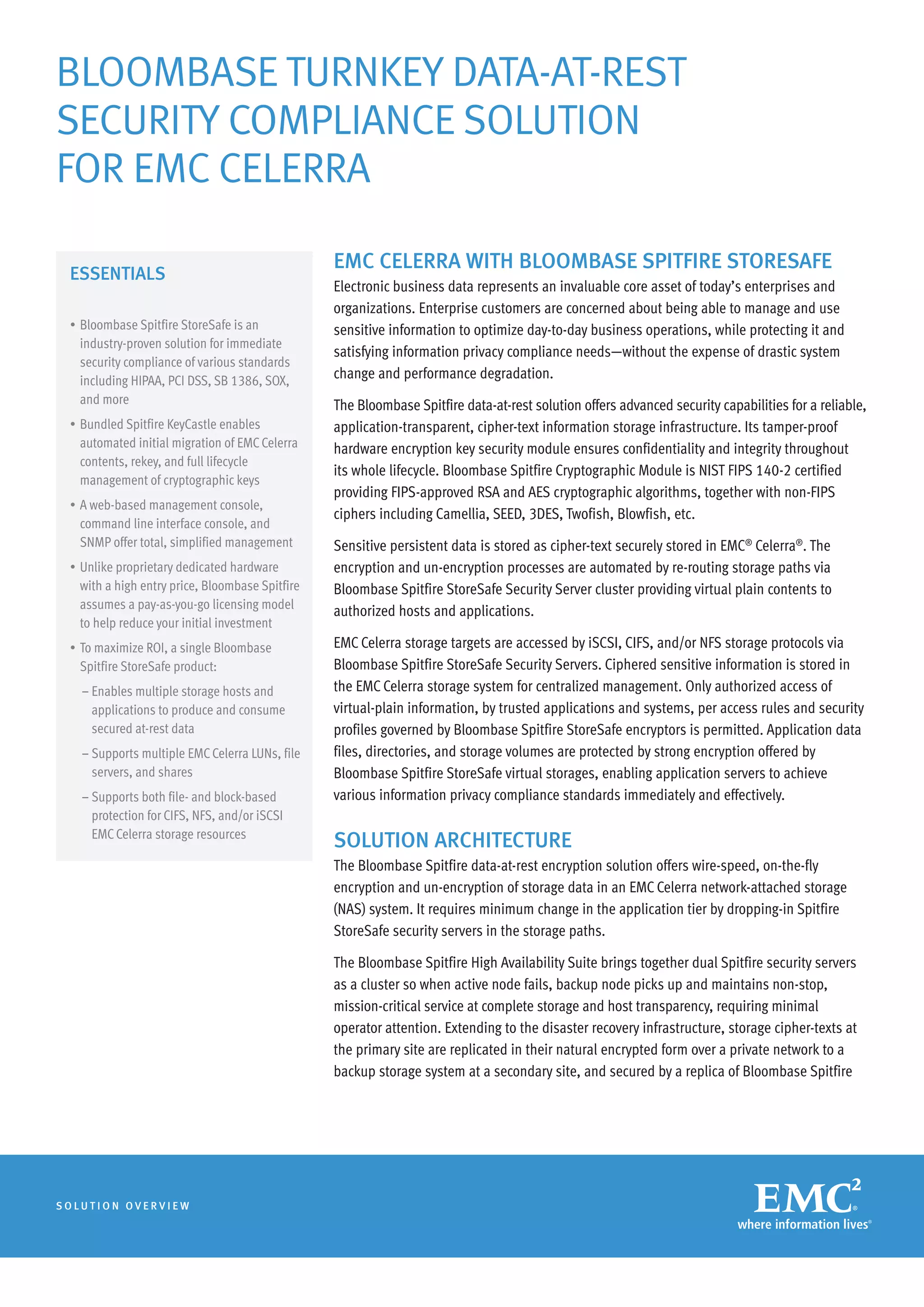 The document describes the Bloombase Spitfire data-at-rest encryption solution for EMC Celerra storage systems. It provides turnkey encryption that requires minimal changes and enables immediate compliance with standards like HIPAA and PCI DSS. Encryption is performed on data 'at rest' in the EMC Celerra storage using Bloombase Spitfire StoreSafe servers with minimal performance degradation. The solution supports both block and file-based storage on the Celerra through a single Bloombase product.