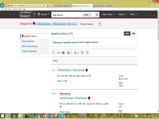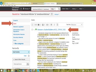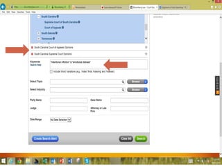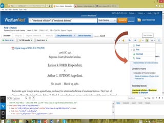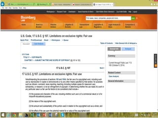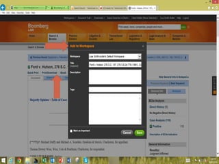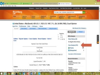 This document provides an overview of how to locate cases and statutes using Bloomberg Law, Lexis Advance, and WestlawNext. Cases and statutes can be found by party name, citation, or subject/keyword searching on all three platforms. The document outlines the steps for conducting searches on each platform to find cases and statutes in each manner. It also discusses how to update searches using the citators (BCite, Shepard's, KeyCite) on each platform to validate research. Help resources are provided at the end for tutorial videos on using each platform most effectively.