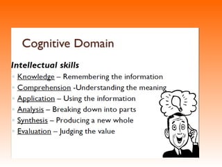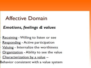 Bloom's Taxonomy is a framework for classifying educational goals and objectives into levels of complexity and specificity. It was created in 1956 by education psychologist Benjamin Bloom and revised in 2001. The taxonomy categorizes learning objectives into three domains: cognitive, affective, and psychomotor. The cognitive domain involves knowledge and intellectual skills and has six levels - remembering, understanding, applying, analyzing, evaluating, and creating. The affective domain deals with attitudes, values, and emotions and also has five levels. The psychomotor domain involves physical skills and manipulations and its levels range from perception to complex overt responses. Bloom's Taxonomy provides a useful guide for designing instructional objectives and assessments across different learning types and depths