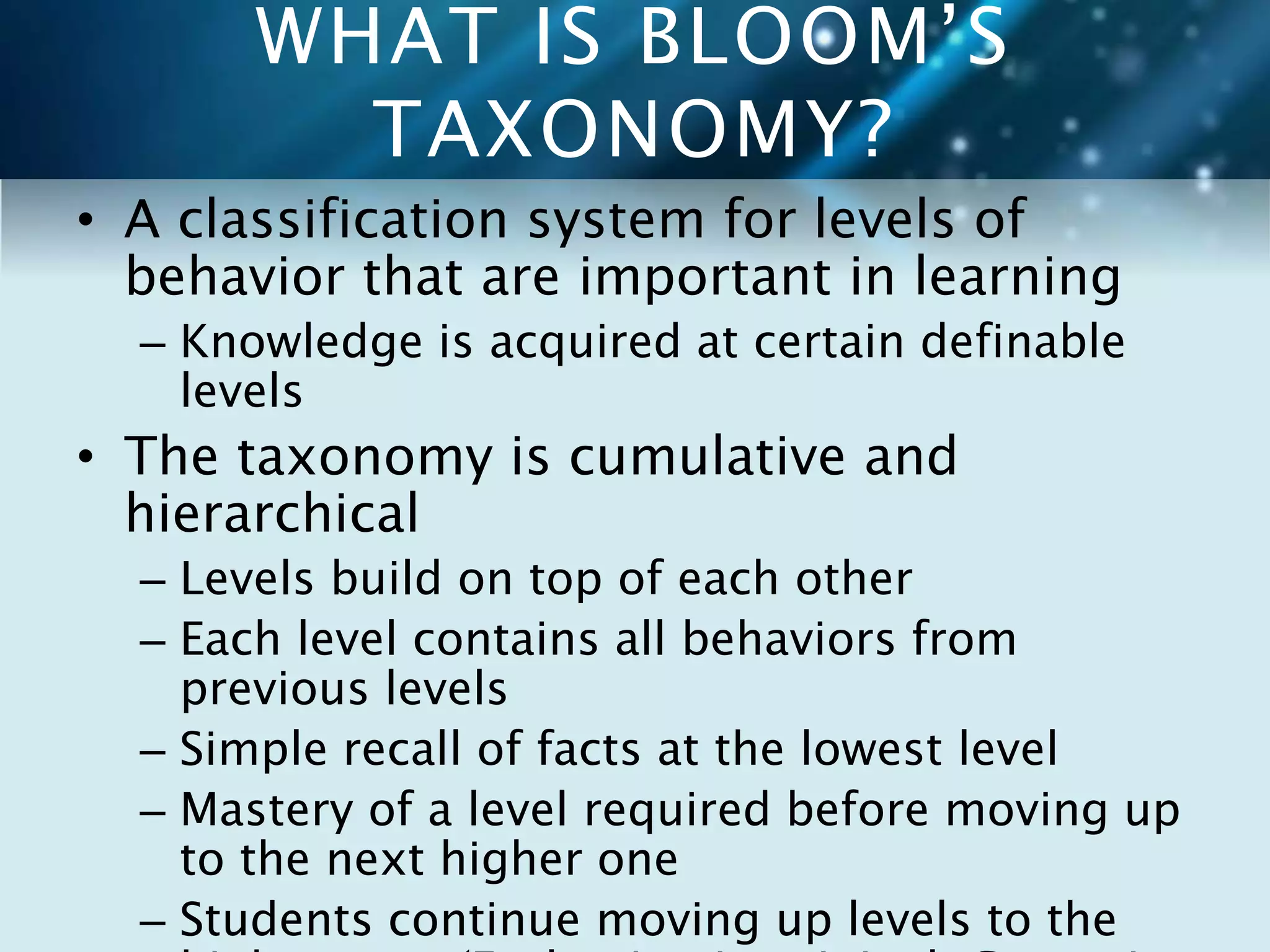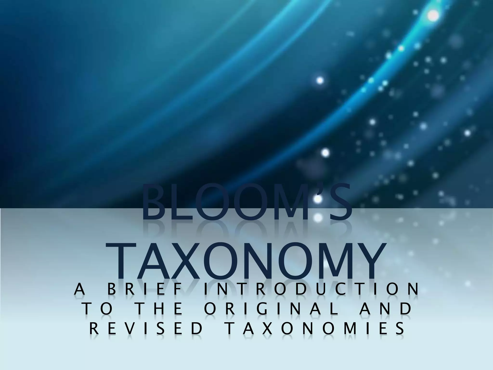 This document provides an overview of Bloom's Taxonomy, including both the original taxonomy developed in 1956 and the revised taxonomy from 2001. The original taxonomy classified learning objectives according to six cognitive levels, from simplest to most complex: Knowledge, Comprehension, Application, Analysis, Synthesis, and Evaluation. Criticisms of the original led to the development of a revised taxonomy that changed the hierarchy to a two-dimensional matrix and renamed some levels and domains.