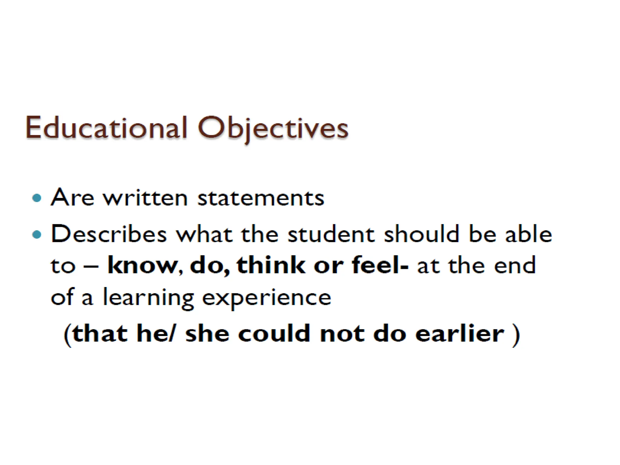 The document discusses educational objectives and Bloom's Taxonomy, highlighting the distinction between aims and objectives, and exploring the cognitive, affective, and psychomotor domains of learning. It details the structure and benefits of both the original and revised Bloom's Taxonomy, emphasizing the importance of higher-order thinking skills and the effective alignment of learning objectives with assessment techniques. Additionally, it provides insights into formulating questions at lower and higher levels of the taxonomy to promote deeper understanding and critical thinking skills among learners.