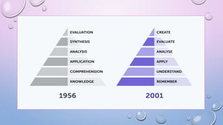 The document discusses Bloom's Taxonomy, a framework for classifying educational objectives developed by Benjamin Bloom. It outlines both the original and revised versions of the taxonomy, highlighting its importance in helping educators define instructional goals and improve learning outcomes. The taxonomy consists of various levels of cognitive skills, ranging from simple recall to higher-order thinking, and serves as a structure for designing educational assessments and experiences.