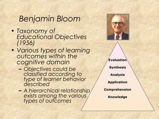 This document provides information on writing lesson objectives using Bloom's Taxonomy. It discusses Bloom's original and revised taxonomies, which classify learning objectives according to the type of learning involved - from basic recall or comprehension to more complex skills such as analysis, synthesis, and evaluation. The document provides examples of verbs to use in writing objectives targeting different levels of learning. It also discusses best practices for writing clear, measurable objectives and assessing whether objectives were achieved.