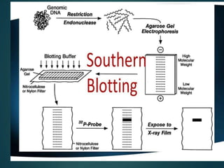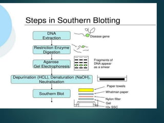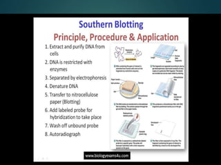 3. For southern blotting, DNA is detected through hybridization with a labeled probe. For western blotting, specific proteins are detected through interaction with labeled antibodies.