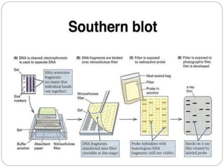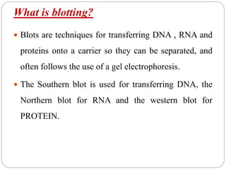 Blotting techniques such as Southern blotting, Northern blotting, and Western blotting allow for the detection of specific DNA, RNA, and protein sequences by transferring them from a separation gel onto a membrane and using probes to detect the targets. Southern blotting detects DNA using DNA probes, Northern blotting detects RNA using RNA or DNA probes, and Western blotting detects proteins using antibodies. These techniques are used for applications like detecting gene expression, RNA splicing, and confirming diseases.
