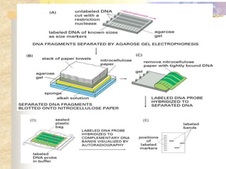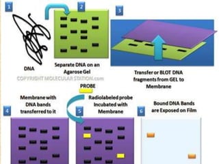 Southern, Northern, and Western blotting techniques allow researchers to detect specific DNA, RNA, and protein sequences, respectively. Southern blotting involves separating DNA fragments via gel electrophoresis, transferring them to a membrane, and using a probe to identify specific sequences. Northern blotting is similar but detects RNA, and Western blotting detects proteins using antibodies. These techniques are used for applications like gene mapping, diagnostics, studying gene expression, and confirming transgenic organisms.