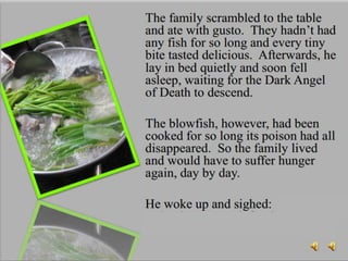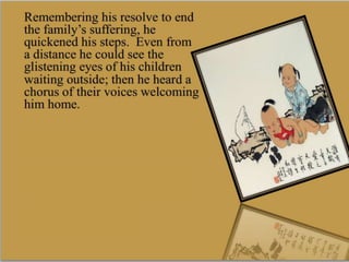 A father returns home with a full basket of fish for his family. His children excitedly greet him at the door, happy he has returned. When they ask about eating the fish, the father mumbles that they can cook it while he leaves somewhere. He thinks to himself, wondering why death has not come yet, as it is so hard to continue living.