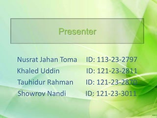 The document discusses the blow room process in the textile industry. It begins with an introduction of the presenters and topic. Then, it describes the basic functions of a blow room as opening, cleaning, mixing and forming laps of fiber. It provides details on various blow room technologies used like Blendomat, Axiflow cleaner, mixer, and dust removal systems. Finally, it outlines the components and functions of a modern blow room line and carding machine.