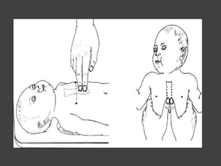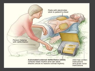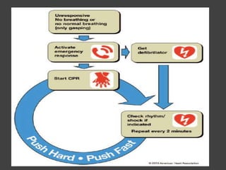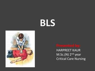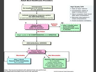 This document provides information on basic life support (BLS). It defines BLS as procedures to restore circulation and oxygenated blood flow after cardiac or respiratory arrest. BLS involves chest compressions, rescue breathing, and defibrillation if needed, and can be performed by anyone without equipment. The key steps of BLS are to check for responsiveness, call for help, check pulse, and if no pulse, begin chest compressions at a rate of at least 100 per minute and depths of at least 2 inches, alternating with rescue breaths. An automated external defibrillator (AED) should be used as soon as available to attempt defibrillation if indicated. BLS is similar for children but uses a compression to ventilation