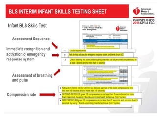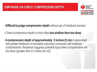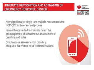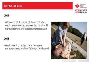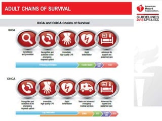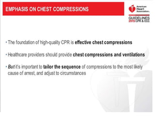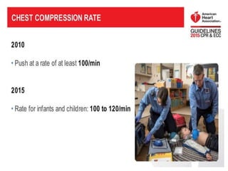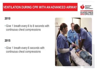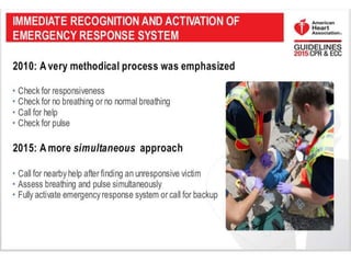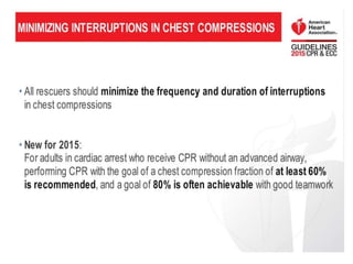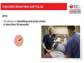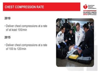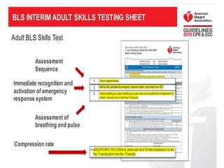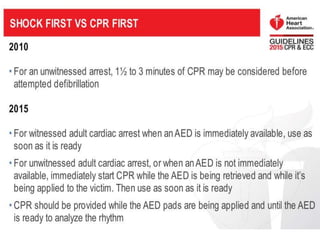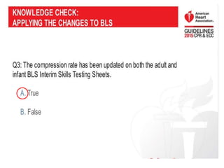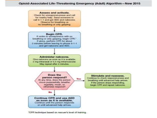 This document discusses guidelines for administering naloxone to patients experiencing an opioid overdose. It states that trained lay rescuers and BLS providers may administer intramuscular or intranasal naloxone in addition to standard BLS care for patients who are unresponsive without normal breathing but have a pulse. It also contains questions about elements of high-quality CPR, appropriate times to use an AED, chest compression rates and depths for adults, and maximum time limits for CPR interruptions.