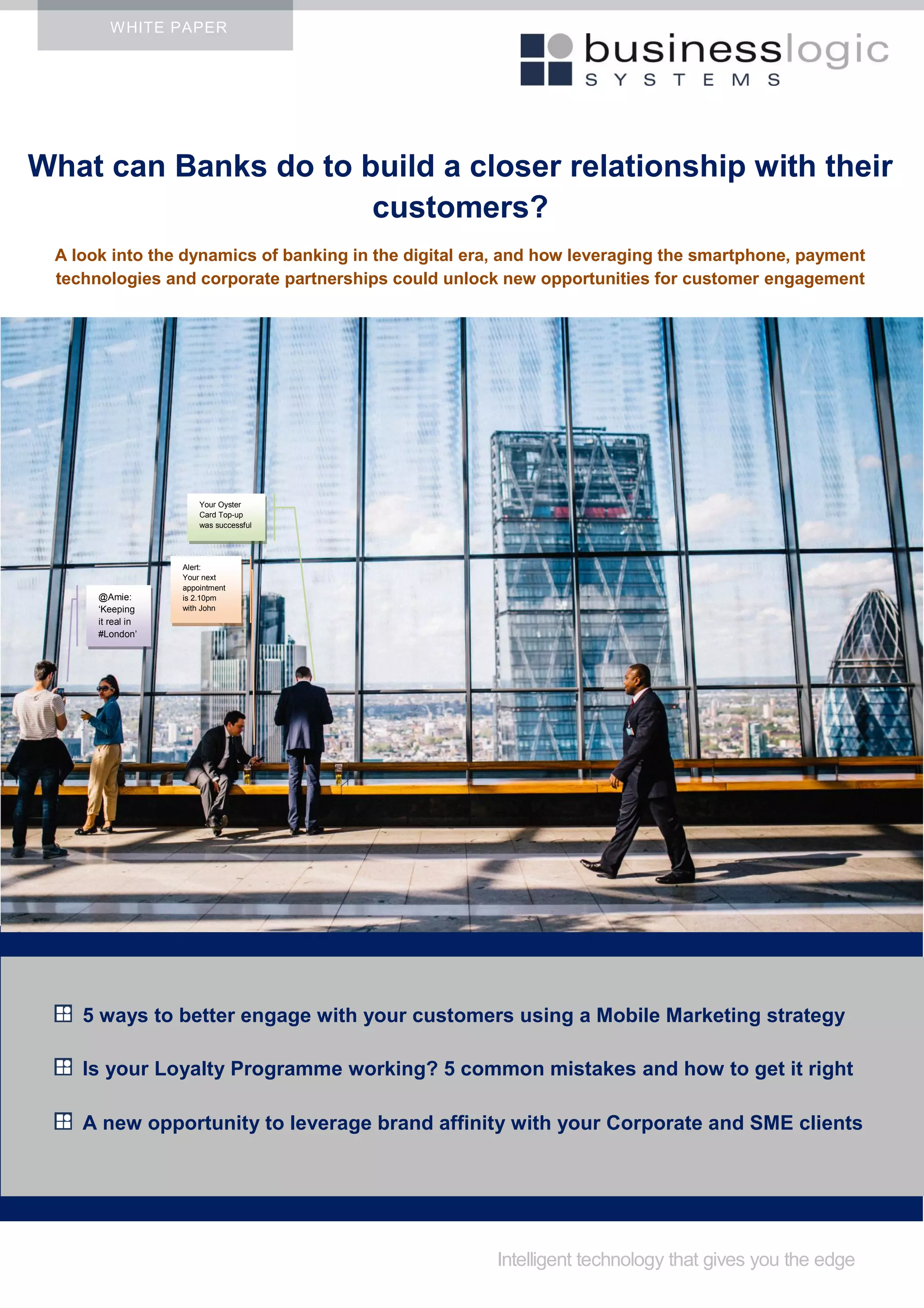 The document discusses how banks can better engage customers in the digital era. It suggests that banks prioritize mobile experiences, enhance loyalty programs, build relationships with corporate partners through co-branded loyalty programs, gamify customer experiences through status levels and rewards, and deliver personalized offers to customers across digital channels based on transaction data insights. The document argues that these strategies can help banks strengthen customer relationships and increase engagement in the current challenging banking environment.