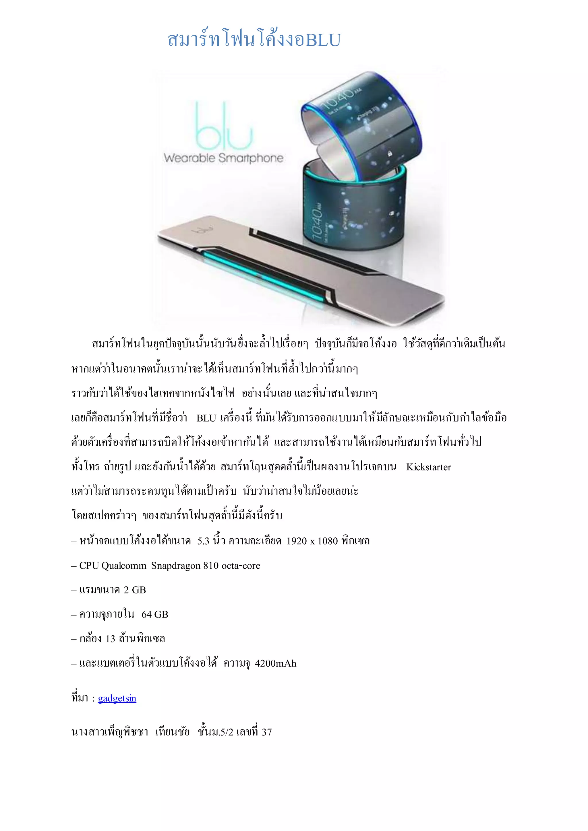 อย่างนั้นเลย และที่น่าสนใจมากๆ เลยก็คือสมาร์ทโฟนที่มีชื่อว่า BLU เครื่องนี้ ที่มันได้รับการออกแบบมาให้มีลักษณะเหมือนกับกาไลข้อมือ ด้วยตัวเครื่องที่สามารถบิดให้โค้งงอเข้าหากันได้ และสามารถใช้งานได้เหมือนกับสมาร์ทโฟนทั่วไป ทั้งโทร ถ่ายรูป และยังกันน้าได้ด้วย สมาร์ทโฤนสุดดล้านี้เป็นผลงานโปรเจคบน Kickstarter แต่ว่าไม่สามารถระดมทุนได้ตามเป้าครับ นับว่าน่าสนใจไม่น้อยเลยน่ะ โดยสเปคคร่าวๆ ของสมาร์ทโฟนสุดล้านี้มีดังนี้ครับ – หน้าจอแบบโค้งงอได้ขนาด 5.3 นิ้ว ความละเอียด 1920 x1080 พิกเซล – CPUQualcomm Snapdragon 810 octa-core – แรมขนาด 2 GB – ความจุภายใน 64GB – กล้อง 13 ล้านพิกเซล – และแบตเตอรี่ในตัวแบบโค้งงอได้ ความจุ 4200mAh ที่มา : gadgetsin นางสาวเพ็ญพิชชา เทียนชัย ชั้นม.5/2 เลขที่ 37