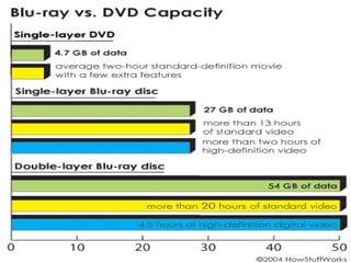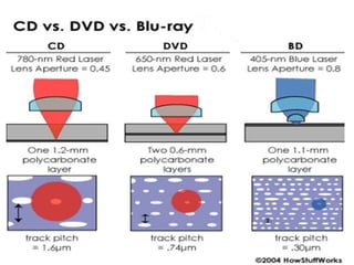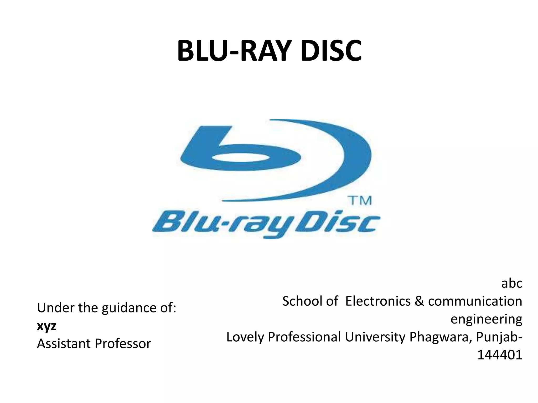 Blu-ray disc is a next-generation optical disc format that was developed to enable high-definition video recording and storage of large amounts of data. It uses a blue laser operating at a wavelength of 405 nm to read very small pits arranged in a continuous spiral track, allowing for 25 or 50 gigabytes of data storage on a single or double layer disc respectively. Blu-ray discs offer benefits over previous formats such as DVD including shorter wavelength for greater precision, higher data density, and increased durability. Ongoing developments aim to further increase storage capacity and compete with video on demand technologies.