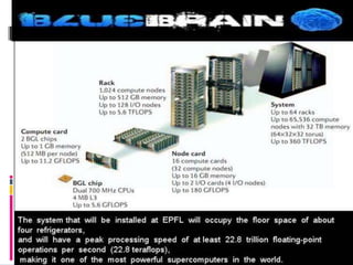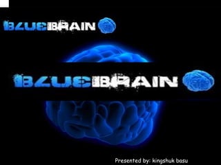 The Blue Brain project aims to create the world's first virtual brain through detailed computer simulation. The IBM is developing Blue Brain, a supercomputer that functions similarly to the human brain. Within 30 years, scientists believe we will be able to scan our brains into computers. The goal is to understand how human intelligence works and potentially help cure diseases like Parkinson's. Once complete, Blue Brain could allow storing knowledge, skills and memories even after death for the benefit of humanity.