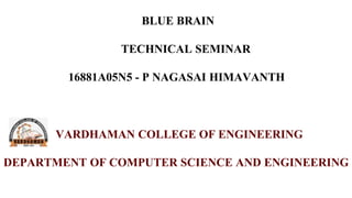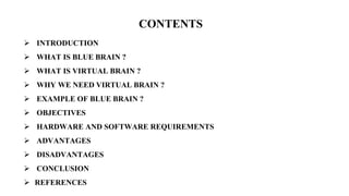 This document discusses the Blue Brain project, which aims to create a virtual human brain through supercomputing. The Blue Brain would function like a human brain by thinking, responding, and storing memories. It could help upload a person's intelligence and skills, allowing them to be remembered forever. The project seeks insights into human cognition and may help cure diseases like Parkinson's. It would require powerful hardware, software to translate brain signals, and nanobots as an interface between biological and virtual brains. While it could enhance memory and decision making, issues around dependency, misuse of data, and human cloning must also be addressed.
