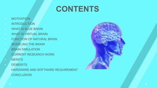 The Blue Brain project aims to create the first virtual brain by simulating the brain down to the molecular level on supercomputers. It involves modeling neurons, connections between neurons, and brain circuits through intensive computation. The goal is to understand how the human brain works and potentially lead to treatments for brain diseases. In the future, it may be possible to upload a human brain into a computer through nanobots scanning brain structure and activity, allowing one to live on digitally after death.