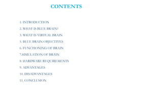 This document discusses the Blue Brain project, which aims to create a virtual human brain through detailed computer simulation. The Blue Brain project is led by IBM and aims to simulate the human brain down to the molecular level within 30 years. This would allow human intelligence, knowledge, and skills to potentially be uploaded into a computer system. The virtual brain would require extremely powerful supercomputers, memory, and software to simulate the complex network of neurons in the human brain. Both advantages like extended intelligence and disadvantages like dependency on computers are discussed for creating a virtual human brain.