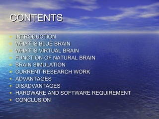 This document provides an overview of Blue Brain, the first virtual brain being developed by IBM and the Brain and Mind Institute. It discusses how Blue Brain will simulate the functions of a natural brain, such as taking inputs, interpreting them, and producing outputs. The document also covers how researchers plan to upload an actual human brain by using nanobots to scan brain structures and connections and input that data into a supercomputer. Once completed, Blue Brain would allow human intelligence and knowledge to persist digitally even after death.