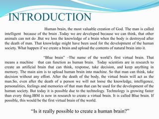 IBM is developing a virtual brain called Blue Brain that could be the world's first virtual brain. Blue Brain would function like a human brain by thinking, making decisions, and storing memories. Researchers aim to upload the human brain into this virtual brain using nanobots, allowing one to live on digitally after death. This could preserve human intelligence and knowledge for further development. However, becoming reliant on computer systems may introduce new vulnerabilities like viruses that could harm or control virtual brains.