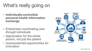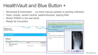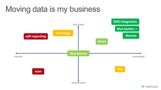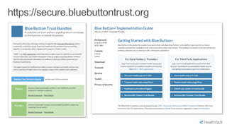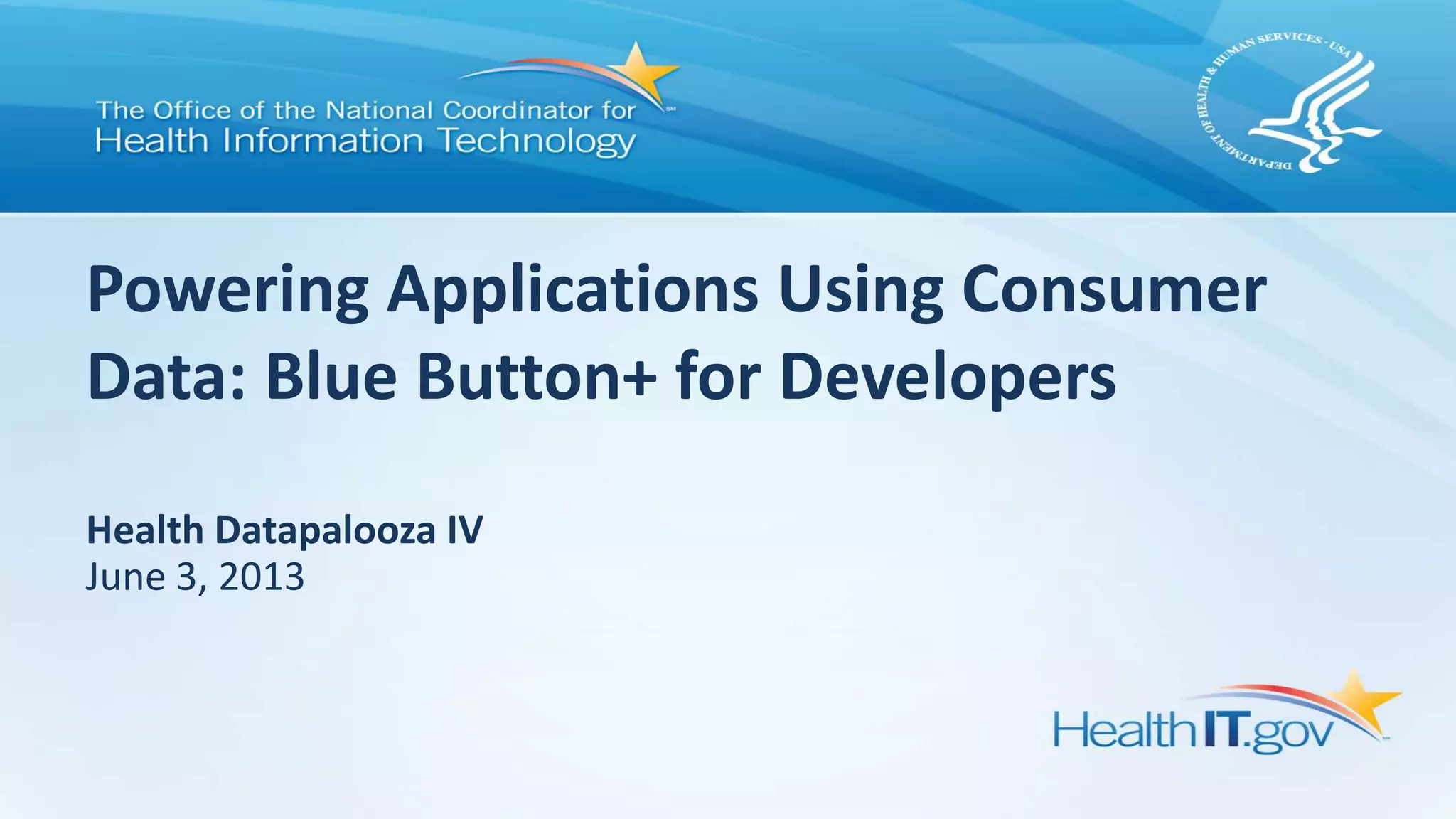 The document discusses the Blue Button+ initiative, which enables consumers to access and download their health records, highlighting its growth from 1.5 million users in 2010 to over 88 million. It addresses the limitations of the original Blue Button, such as data unstructure and lack of secure transport, and outlines the improvements needed for Blue Button+. Additionally, it emphasizes the significance of consumer data in healthcare transformation and invites participation in ideation for its future use.