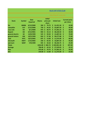 The document analyzes the performance of various stocks purchased between 1999-2002. It shows the initial purchase price and number of shares for each stock, as well as the current price. Overall, the stock values have increased by $85,271.70 since purchase, a gain of 7.10% on average. However, some stocks like 3M are down over -59%, while others like Intel and GE have increased over 500% and 137% respectively.