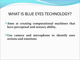 WHAT IS BLUEEYES TECHNOLOGY? Aims at creating computational machines that have perceptual and sensory ability. Use camera and microphone to identify user actions and emotions
