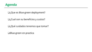 The document outlines the concept and implementation of blue-green deployment within a DevOps context, covering its benefits, costs, and necessary precautions. It emphasizes the importance of minimizing downtime during software production releases and highlights strategies for rapid rollbacks, especially in scenarios involving backward incompatible changes and database migrations. The document also presents a live demo and warns about potential pitfalls related to shared infrastructures and long-running transactions.