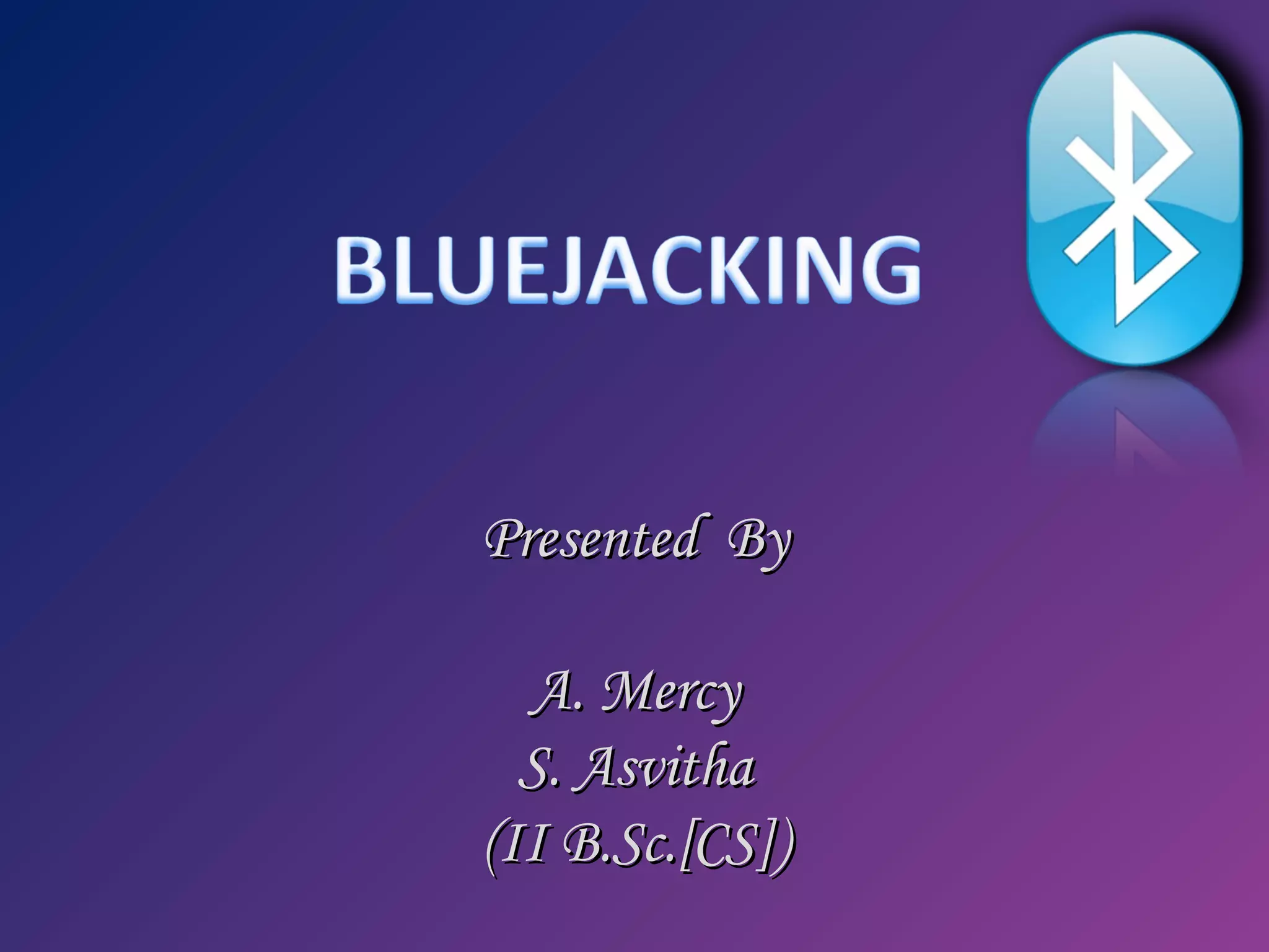 This document discusses bluejacking, which is sending unsolicited messages to Bluetooth-enabled devices. It provides an example of a man named Ajack who sent a message saying "Buy Ericsson!" to a Nokia phone he discovered with Bluetooth. It then explains how to enable Bluetooth and send messages to other devices. It discusses software tools for bluejacking and possible locations to find targets. It covers related concepts like bluesnarfing and ethics around bluejacking. Controls are suggested like turning Bluetooth off when not in use. While it could be used to advertise, it is also an offense under law.