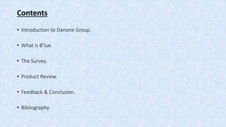 This document provides information about B'lue, a flavored water product made through a joint venture between Danone Group and Narang Beverages. It introduces Danone Group and describes B'lue's flavors, ingredients, packaging and marketing survey results. The survey of 30 people found that most were unfamiliar with the brand but liked it and would consider purchasing it again. However, most still preferred mineral or packaged waters over B'lue. The document concludes that more advertising is needed to increase awareness and popularity of B'lue.