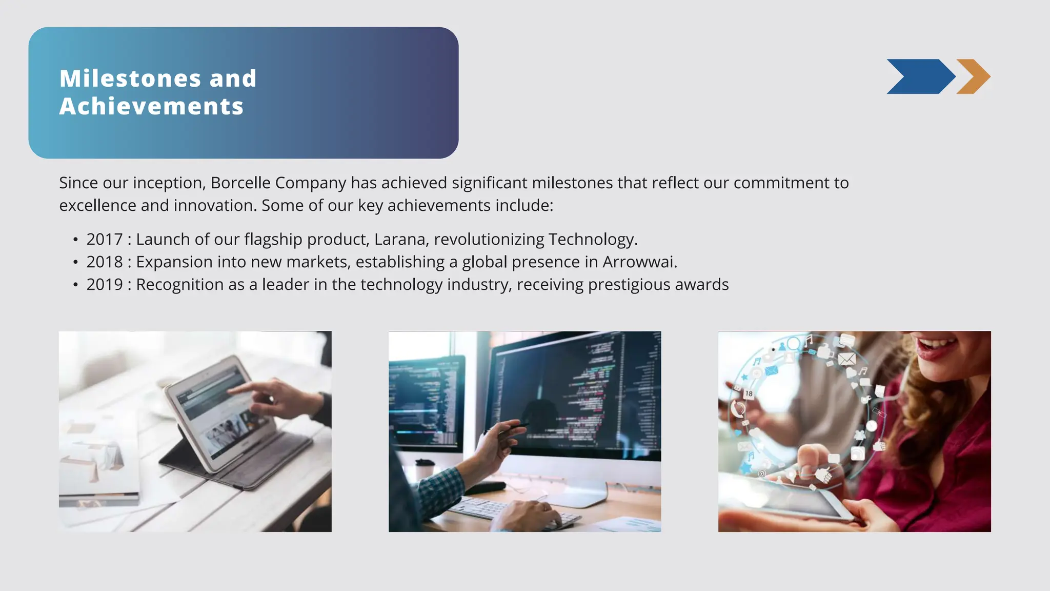 Borcelle Company has established itself as a leader in the technology sector since its inception, launching innovative products like the Borcelle Digital Platform and the Borcelle AI Assistant. The company targets a diverse range of markets, provides customizable solutions, and employs a go-to-market strategy focused on customer value and strong market presence. Future plans include enhancing existing solutions, launching new products, and expanding into new geographic markets and industry verticals.