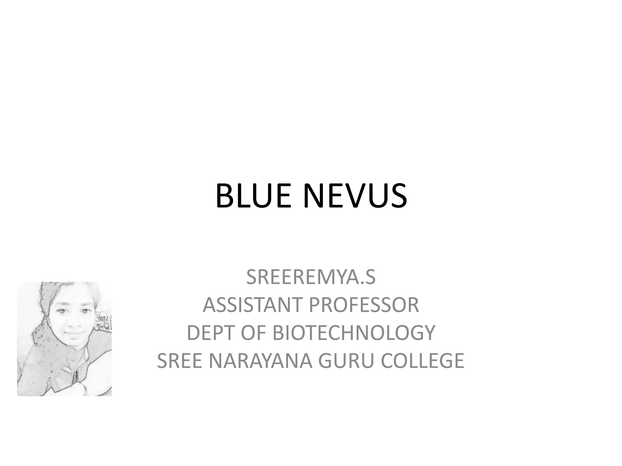 Blue nevi are melanocytic tumors appearing as blue, gray, brown, or black nodules, often confused with pigmented nevi or melanoma. They include variations such as common blue nevus and cellular blue nevus, each with specific characteristics and histopathological features. Typically found on the skin, their presentation and diagnosis can be varied, with some exceptional forms noted in different locations.