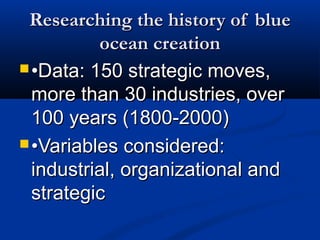 This document summarizes key concepts from Blue Ocean Strategy by W. Chan Kim and Renee Mauborgne. It discusses how blue ocean strategy aims to create uncontested market space and make competition irrelevant by breaking the value-cost tradeoff. Key frameworks covered include the strategy canvas, four actions framework, buyer utility map, and sequence for validating blue ocean ideas. Overall, the document provides an overview of blue ocean strategy and the tools used to identify and capture new demand in unexplored market spaces.