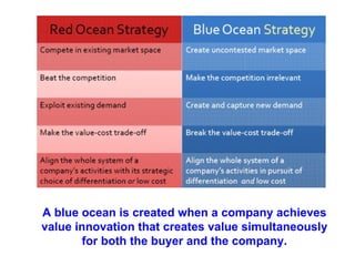 A blue ocean is created when a company achieves value innovation that creates value for both the buyer and the company at the same time. Value innovation refers to developing an innovative product or service that provides new and greater benefits to customers at a lower cost. This allows the company to create a new market space and make competition irrelevant by making their offering very appealing to buyers.