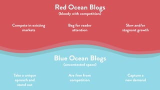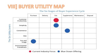 1. It compares red ocean strategy, which focuses on competition, to blue ocean strategy which creates new market space and makes competition irrelevant.