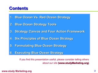 Blue Ocean Strategy is an approach to strategy formulation and execution that aims to create new market space and make competition irrelevant. It involves reconstructing market boundaries, focusing on the big picture rather than numbers, reaching beyond existing demand, and getting the strategic sequence right. Executing blue ocean strategy requires overcoming organizational hurdles like cognitive biases and resource constraints through techniques like engaging disgruntled customers and redirecting resources from less productive areas.