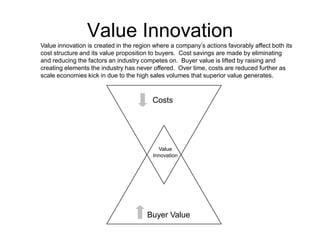 Value innovation creates favorable impacts on both cost structure and value proposition to buyers. It reduces costs by eliminating unnecessary industry factors and lifts buyer value by creating new elements the industry has never offered before. Over time, costs are reduced further through scale economies generated by superior value. Red ocean strategy competes in existing market space while blue ocean strategy creates uncontested market space to make competition irrelevant. The six principles of blue ocean strategy are reconstructing market boundaries, focusing on the big picture, reaching beyond existing demand, getting the strategic sequence right, overcoming organizational hurdles, and building execution into strategy.