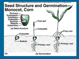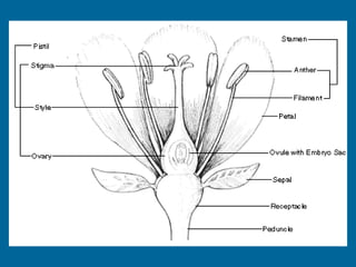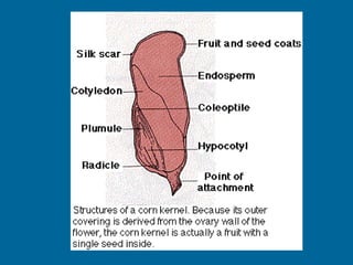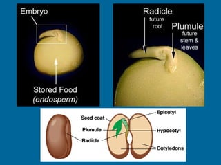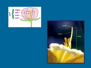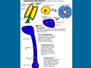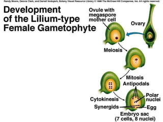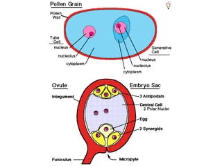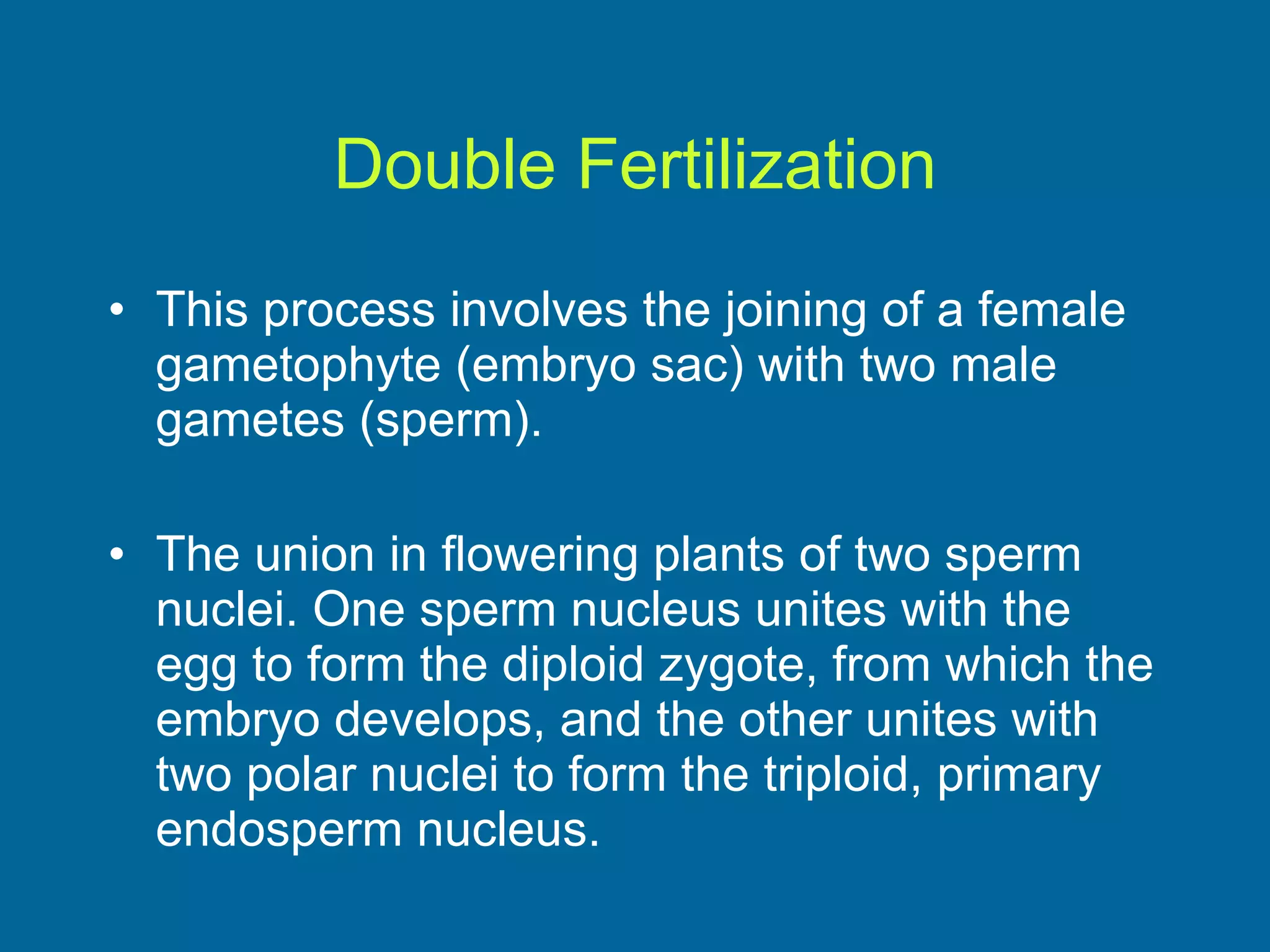 1. Double fertilization involves the union of two sperm cells with an egg and polar nuclei in flowering plants. One sperm fertilizes the egg to form the zygote, and the other fertilizes the polar nuclei to form the endosperm.