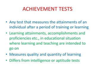 - Achievement tests measure students' learning attainments and proficiencies after a period of instruction. They assess how well learning objectives were met.