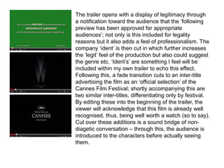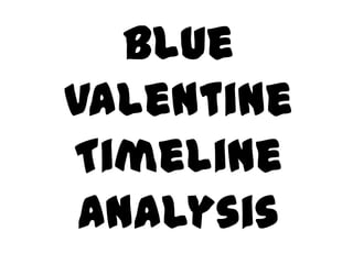 The document analyzes the trailer for the 2010 film Blue Valentine. It summarizes the trailer's use of footage, shots, lighting and other elements to portray the film's romance genre and themes of intimacy, emotion, and the ups and downs of relationships. Key techniques discussed include the use of close-ups and long takes to depict emotional moments, as well as lighting, locations and acting to represent different stages of the relationship from passion to struggle. The trailer aims to attract audiences by highlighting these elements of romance and drama through its editing choices.