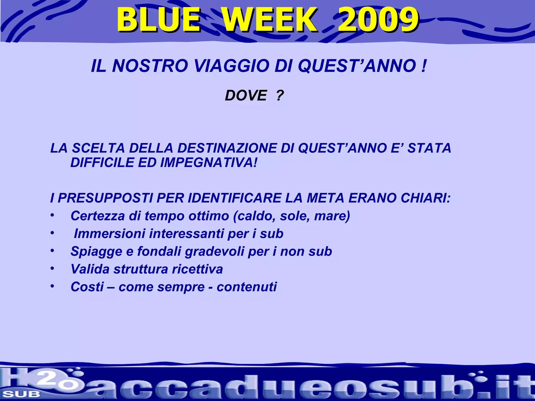La Blue Week 2009 si è svolta a Marsa Alam, una meta emergente del Mar Rosso, scelta per le sue immersioni, spiagge incontaminate e clima favorevole. Gli ospiti hanno soggiornato in un resort all-inclusive con strutture per subacquei e diverse attività, tra cui escursioni e snorkeling. Il viaggio si è concluso con un programma di immersioni ai migliori siti, richiedendo requisiti specifici per partecipare.